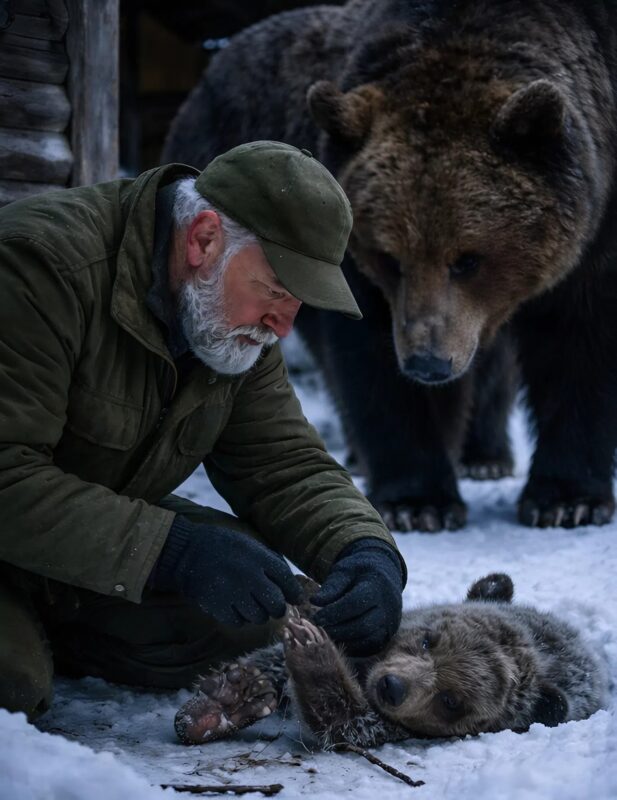 Lorsque le vieil homme se pencha vers l’ourson, il remarqua une fine boucle métallique sur sa patte. C’était un piège de braconnier, profondément enfoncé dans la peau. L’ourson bougeait à peine et respirait difficilement.
