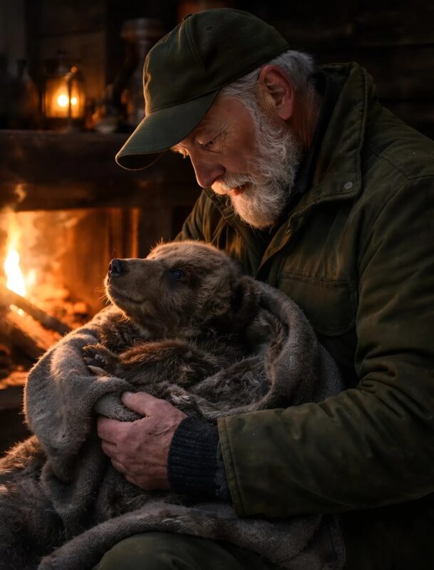 Le vieil homme ouvrit la boucle avec précaution et libéra la patte. Puis il prit le petit animal et le porta dans la maison. Il plaça l’ourson près du poêle, le couvrit d’une vieille couverture en laine et commença à le frotter doucement pour le réchauffer.